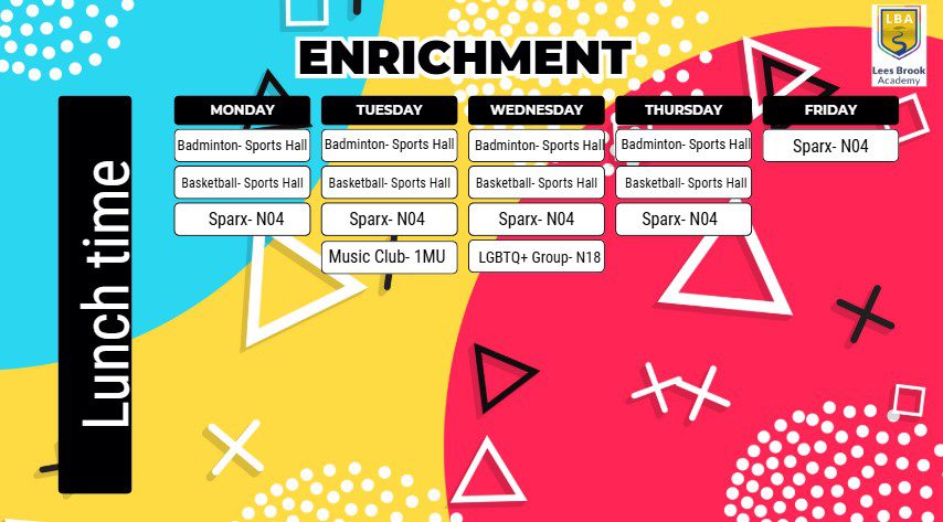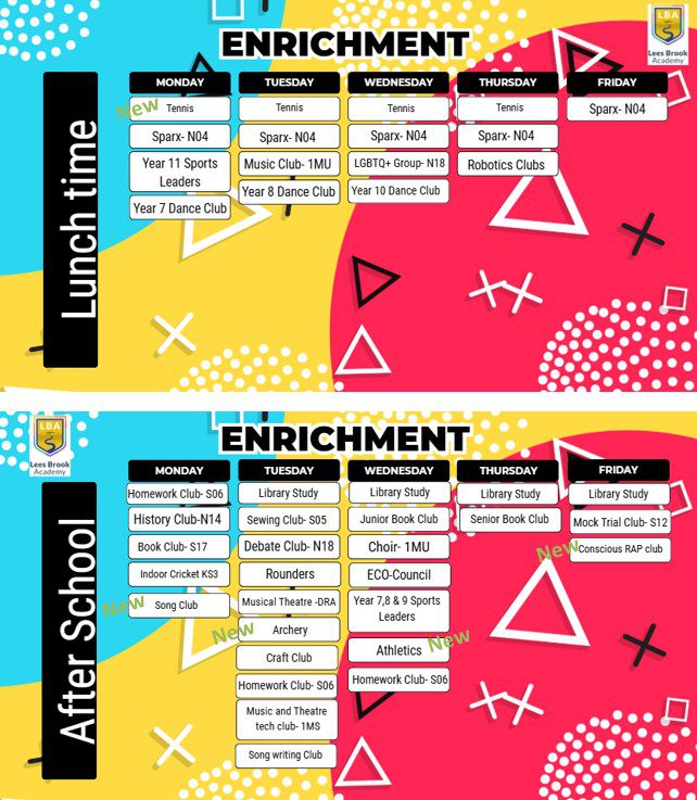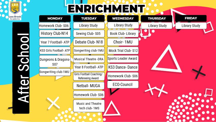 Lees Brook Academy is passionately committed to developing every facet of the young people in our care. We believe that while academic success of is a prime concern, we should pay equal attention to the support and development of our students’ physical, mental and spiritual potential. Our enrichment programme reflects this ethos providing opportunities for all students to explore new interests, challenge themselves and have a lot of fun!